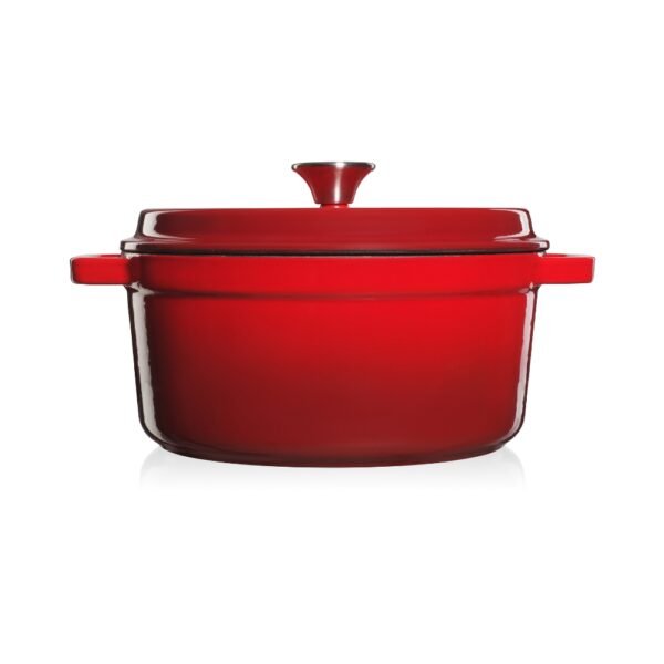 Enamelled cast-iron pot. The stylish, minimalist design casserole pot with a lid is a guarantee of longevity and durability. This pot makes the most delicious porridges, soups, sauces and stews. Perfect for making bread or pies. The pot has wide handles, making it easy to pick up with gloves. The pot heats up slowly, evenly and maintains a stable heat. The stylish design will fit into any kitchen interior, and the beautiful packaging will be useful if you want to give the pot as a gift.