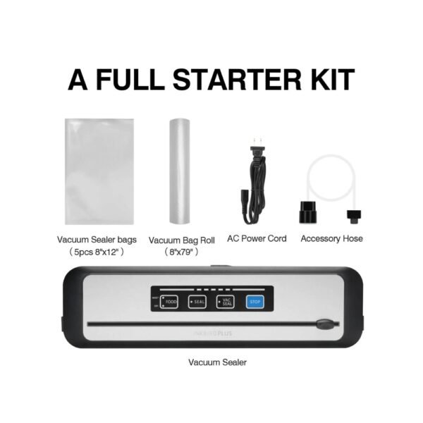 • Includes a vacuum sealer machine, an air suction nozzle and vacuum bags.