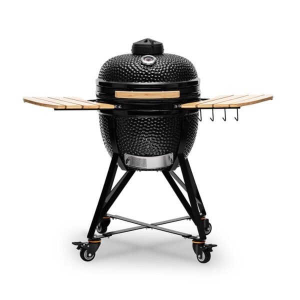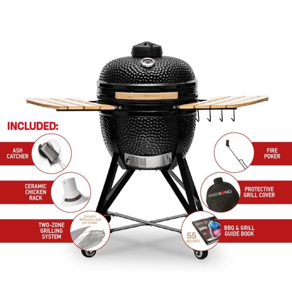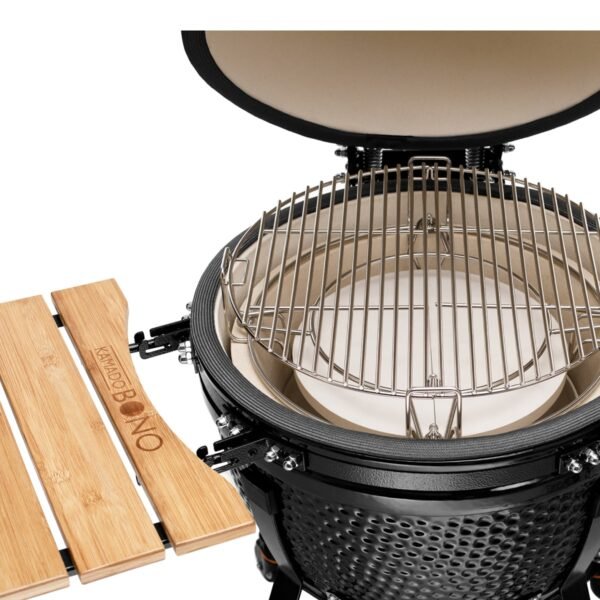 Kamado Bono is a 3-in-1 outdoor grill, oven and smoker. A medium-sized grill is perfect for a backyard, a patio or a holiday home. For a natural person, all ceramic parts come with an unlimited warranty.