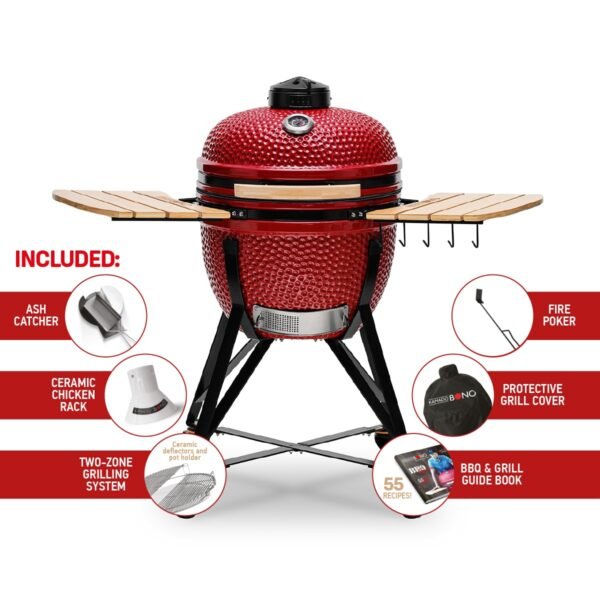 Kamado Bono is a 3-in-1 outdoor grill, oven and smoker. A medium-sized grill is perfect for a backyard, a patio or a holiday home. For a natural person, all ceramic parts come with an unlimited warranty.