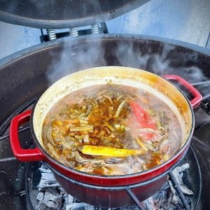 Prepare the Kamado BONO grill, light the charcoal, and place the cast iron griddle on top. Wait for the temperature to reach 180-200°C.