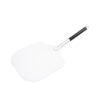 An aluminium pizza peel. The peel is used for loading pizza or other flour dishes into the oven.