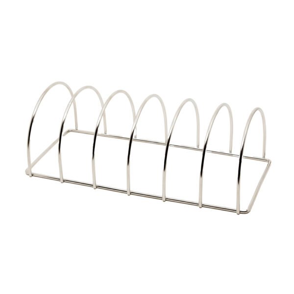A stainless steel rib rack. Designed to accommodate larger quantities of ribs in the grill.